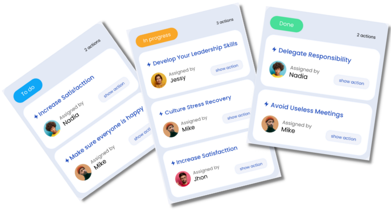 - Når du modtager e-mailen, kan du dykke ned i din rapport og teamets feedback. Det er nemt at udvælge hvilken feedback, der kræver øjeblikkelig opmærksomhed, samt vælge actions blandt vores anbefalinger. Du kan selvfølgelig også lave dine egne.