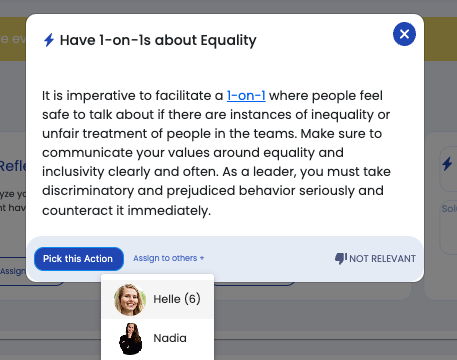 Derfor har vi udviklet Foreslåede Actions. De er skabt af virkelige ledelseserfaringer, research og bedste praksis-rådgivning. Disse Actions foreslås til lederen baseret på feedbackens emne og kompleksitet, og ledere har også mulighed for at tilføje deres egne skræddersyede Actions, når de selv har den rette løsning på en udfordring.