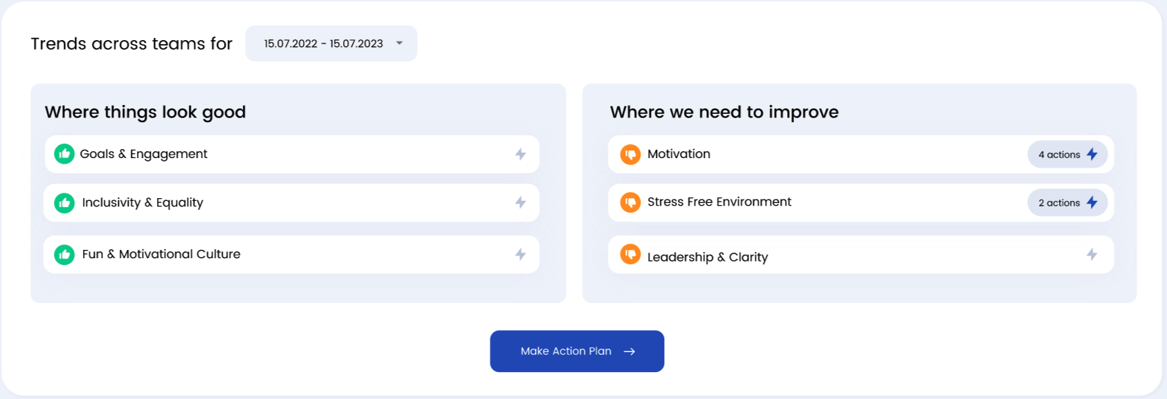 Dette de giver dog en dybere forståelse af tendenser over tid, baseret på folks respons. Dette gælder både på teamniveau og på tværs af hele organisationen.