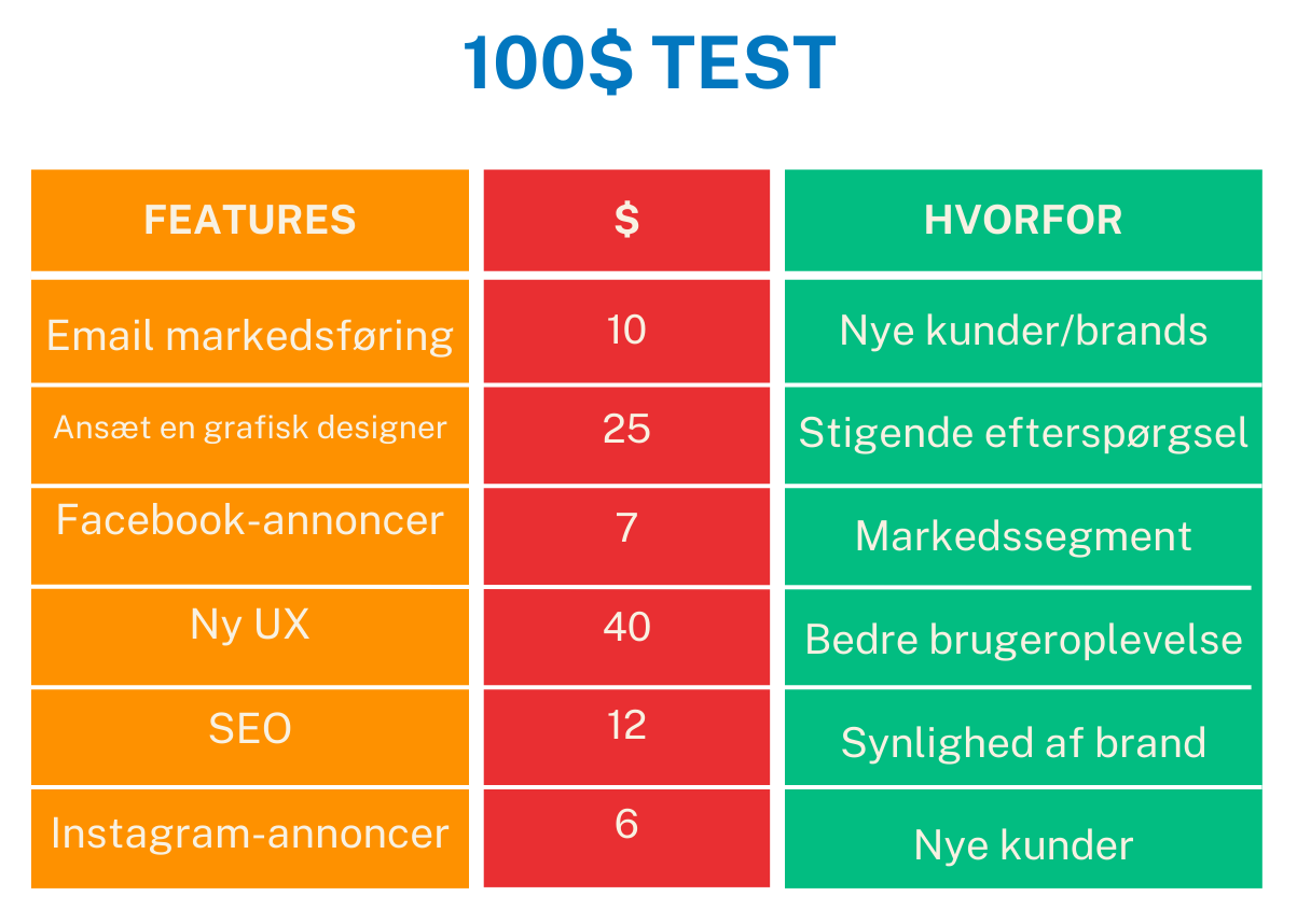 En med funktioner/ideer/projekter (alt afhængigt af målet med workshoppen), en kolonne med et pengetegn og den sidste kolonne med "hvorfor". - Fortæl dit team, at I har 100$, og at I i fællesskab skal bruge pengene på funktionerne/ideerne baseret på deres værdi og vigtighed. Bed dem om at skrive deres begrundelse ned i den sidste kolonne.