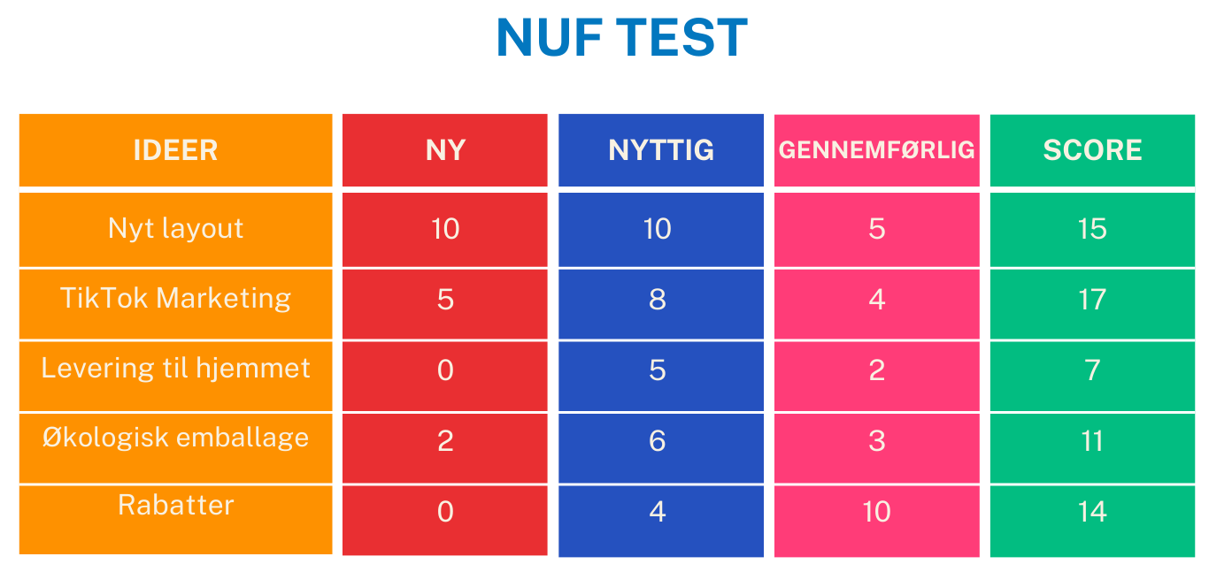- Gennemførlig: Kan vi realistisk set gøre idéen til virkelighed med de ressourcer, vi har?