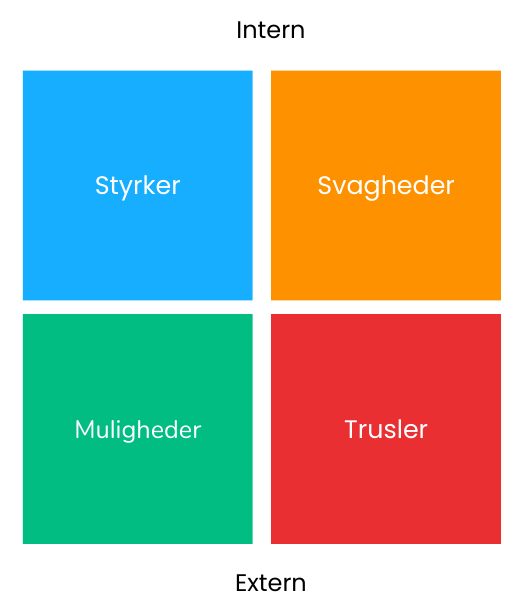 SWOT står for Strengths, Weaknesses, Opportunities og Threats. På dansk er det SVMT, Styrker, Svagheder, Muligheder og Trusler. Det er en meget kendt værktøj så vi holder os til det engelske SWOT når vi nævner det.