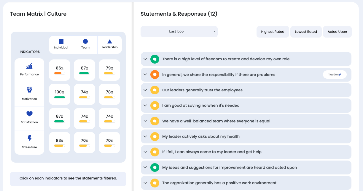 Team leaders get a dashboard with an overview of the indicators and individual statements, where the results are color-coded. This makes it significantly easier to create a quick overview and understand what to celebrate and what is critical and should be prioritized for action to improve.