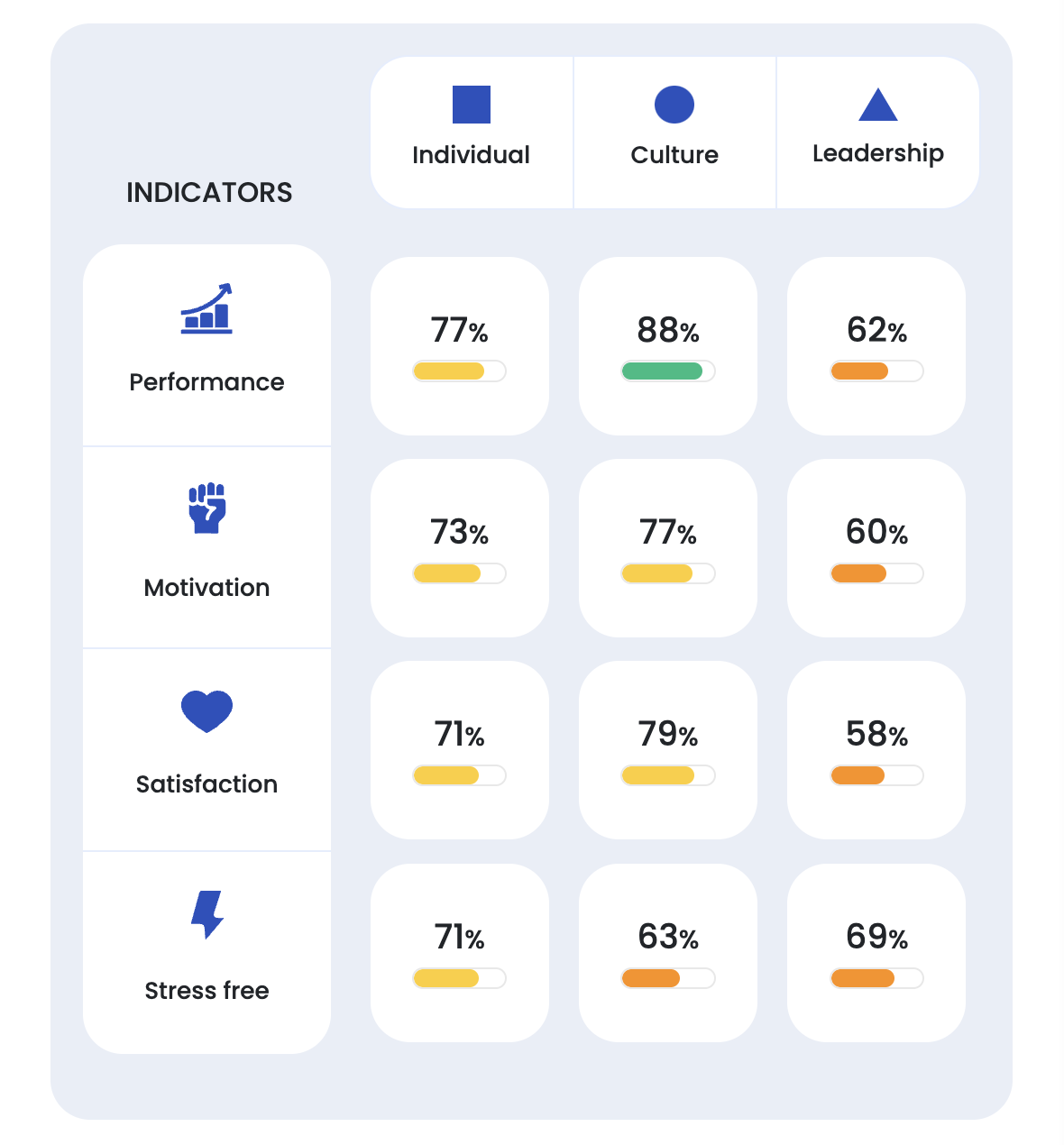 For example, if team motivation decreases, leaders can see which feedback statements triggered the score and how much. It'll give Team Leaders great insight into their team's crucial success factors.