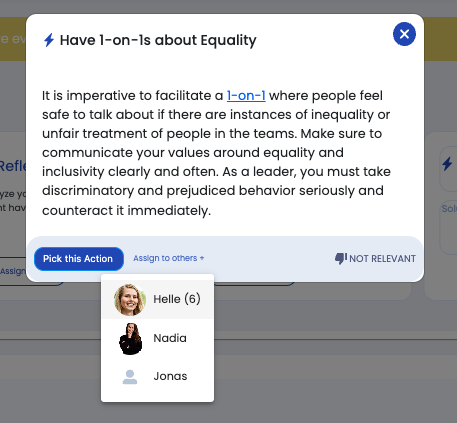 That's why we've developed Suggested Actions. They are created from real-life leadership experiences, research and best practice advice. These Actions are suggested to the manager based on the topic and complexity of the feedback, and managers also have the option to add their own tailored Actions when they have the right solution to a challenge.