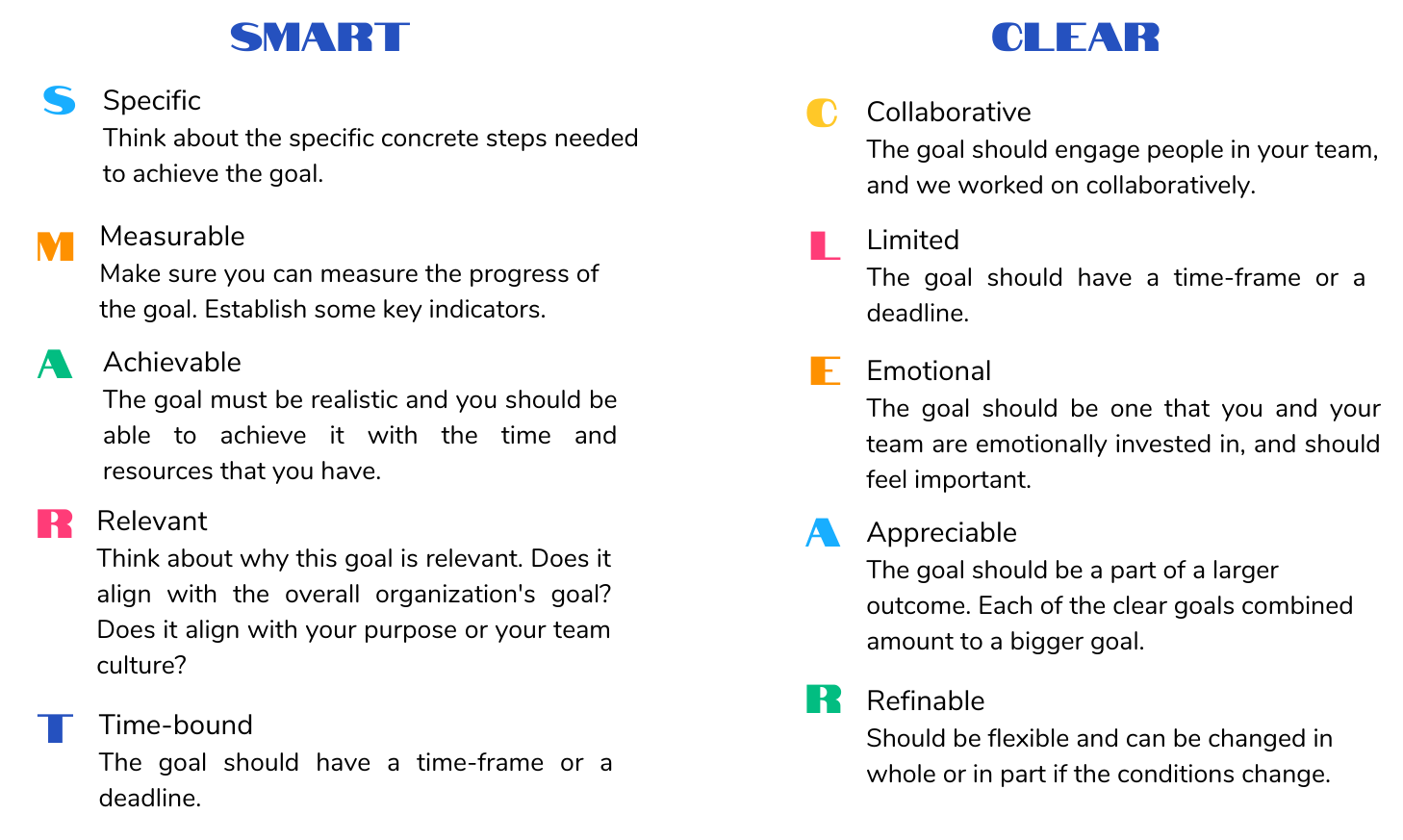 Many have heard of SMART goals, and it is a tried and true best practice in goal setting. CLEAR goals are similar but with a more agile and flexible approach. There are some differences but both overlap in important features, and no matter which approach you take when setting goals, both will provide you with important tools.